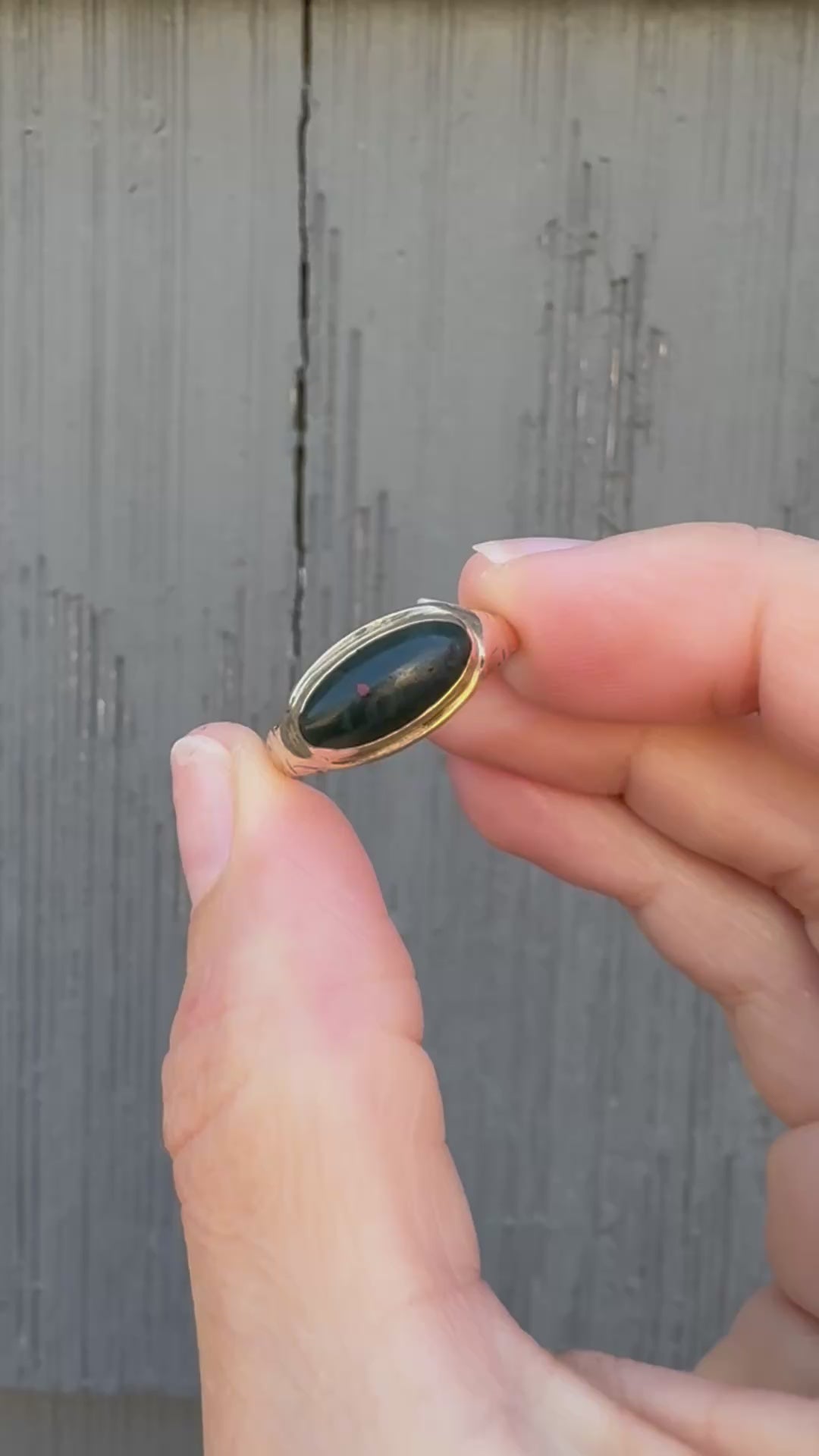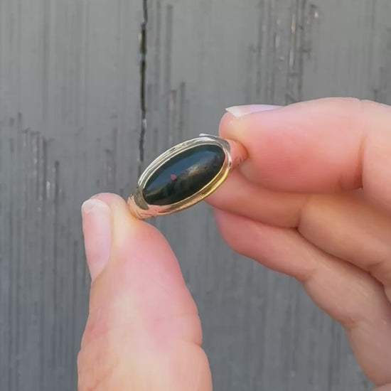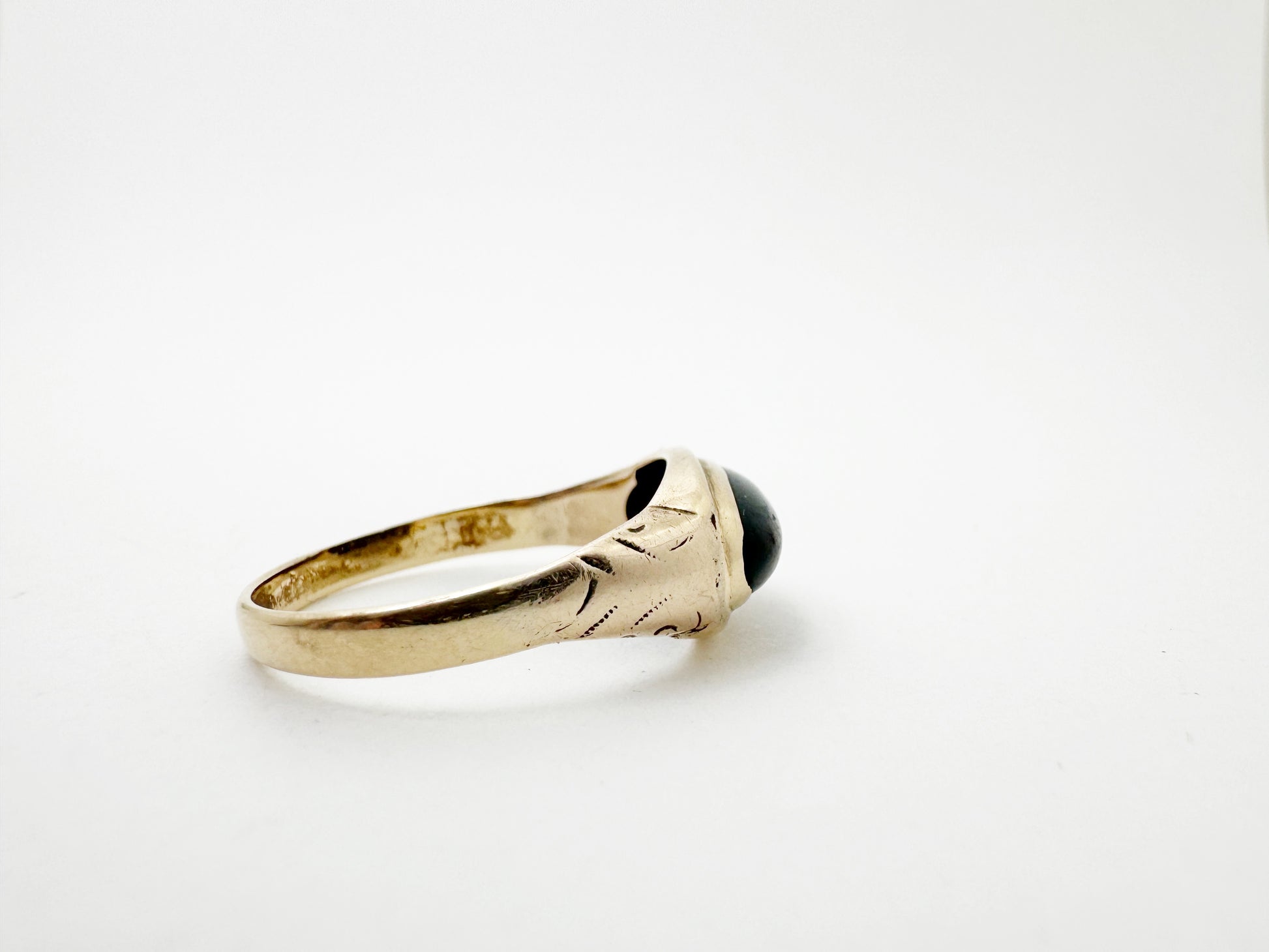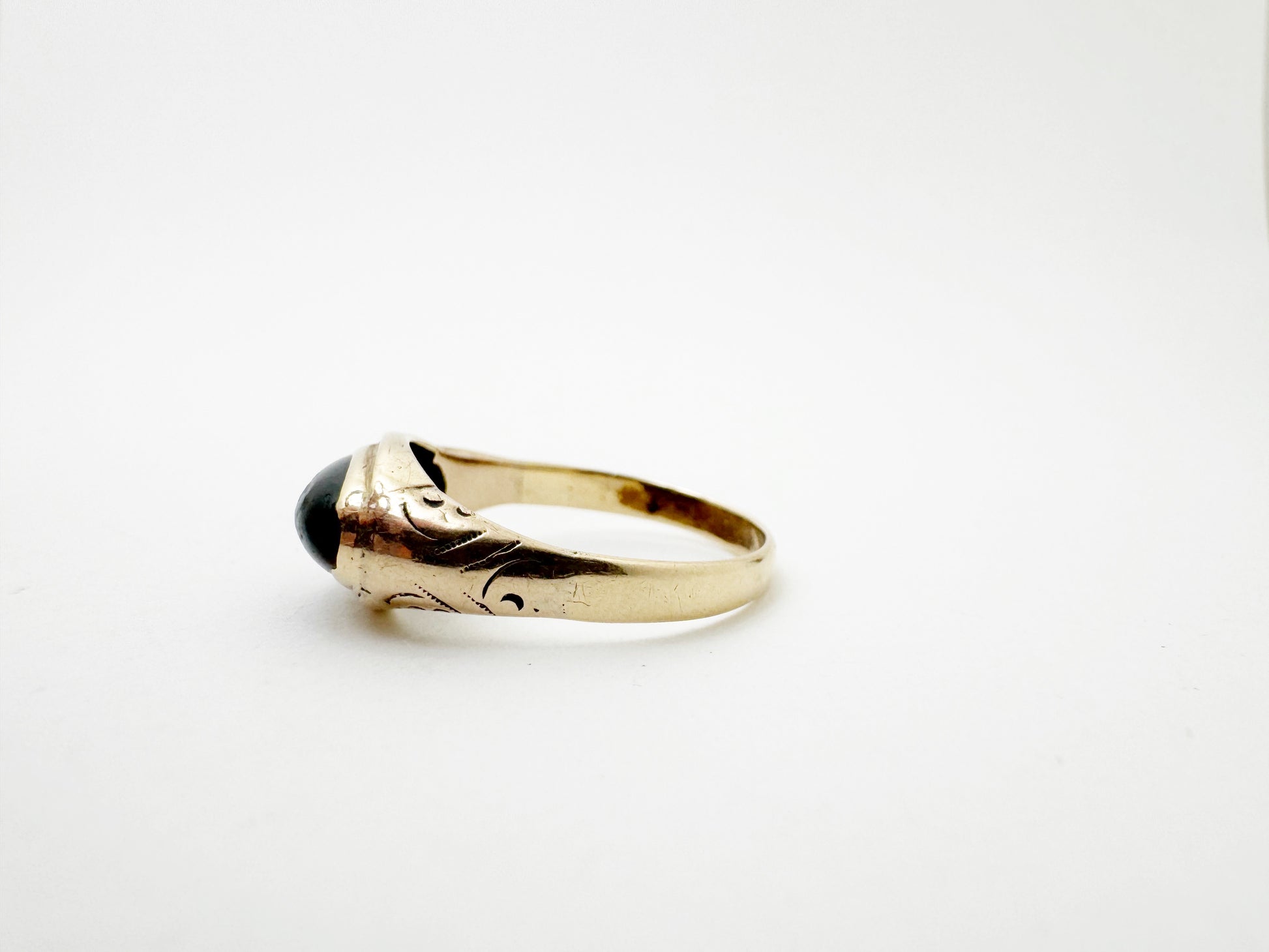 An interesting east-west set bloodstone in a Victorian era 14k gold setting. It has lovely hand chased detailing on the shoulders, which are worn from age.