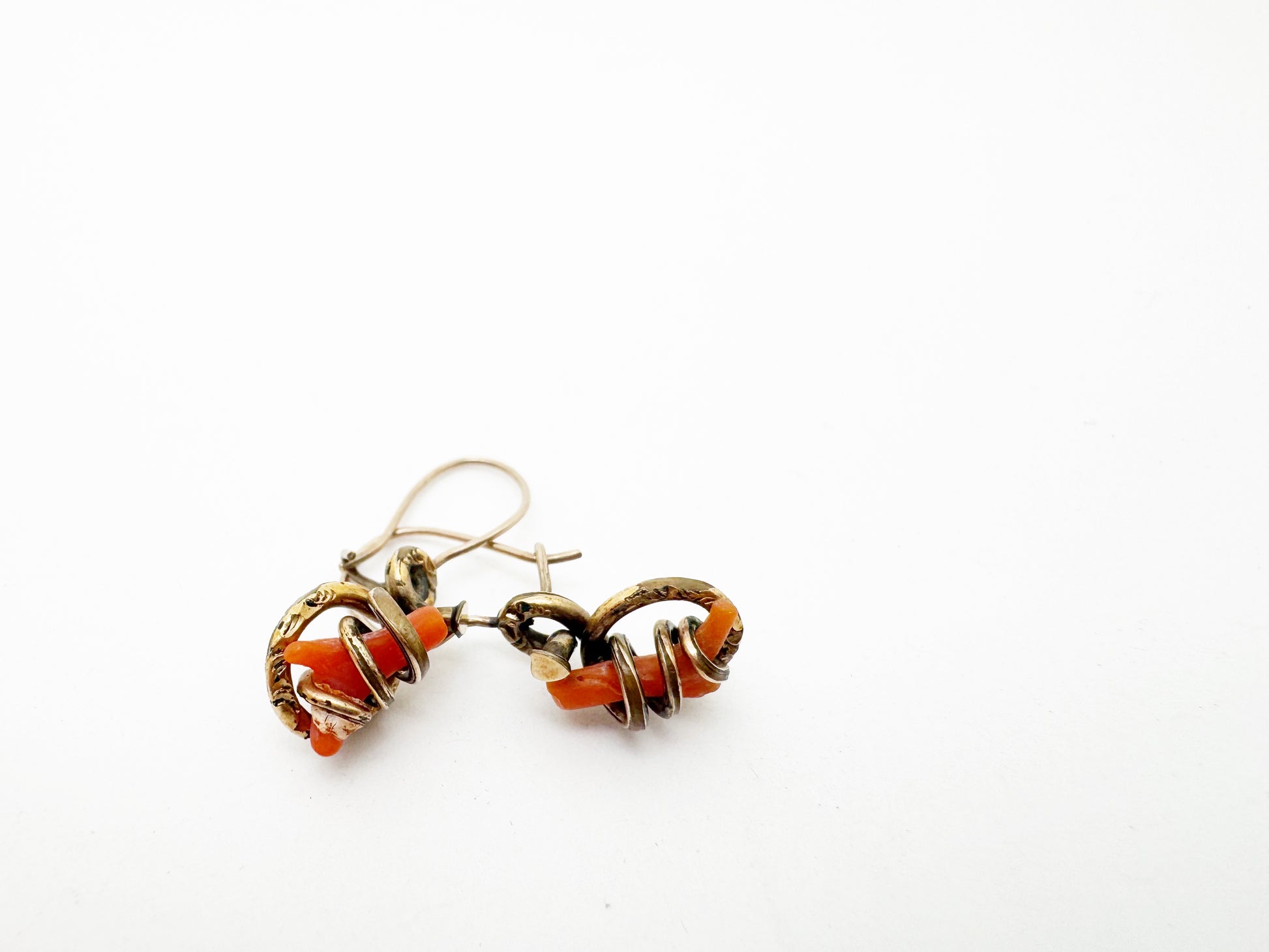 Sweet dainty Victorian earrings with coral branches wrapped in gold fill repousse vines.